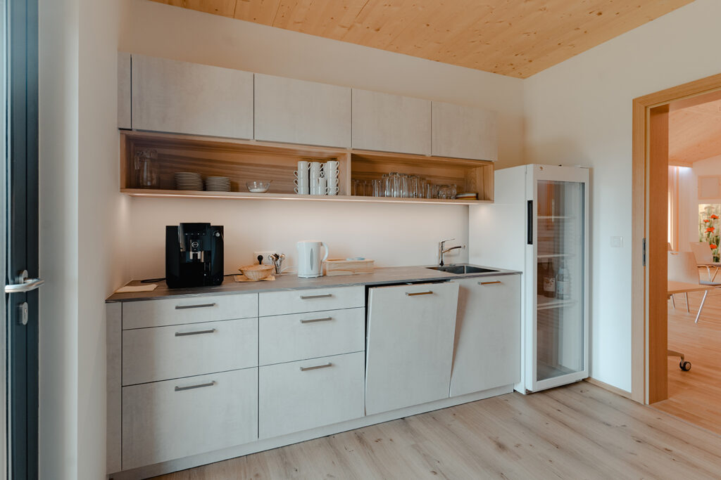 Eine Teeküche mit Getränkekühlschrank ist ebenfalls Teil des Seminarraum Angebotes und sorgt dafür, dass es an nichts fehlt – ideal für Pausenverpflegung.